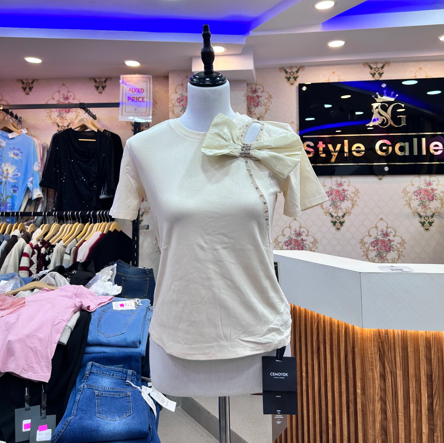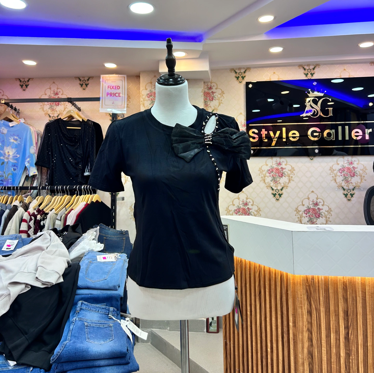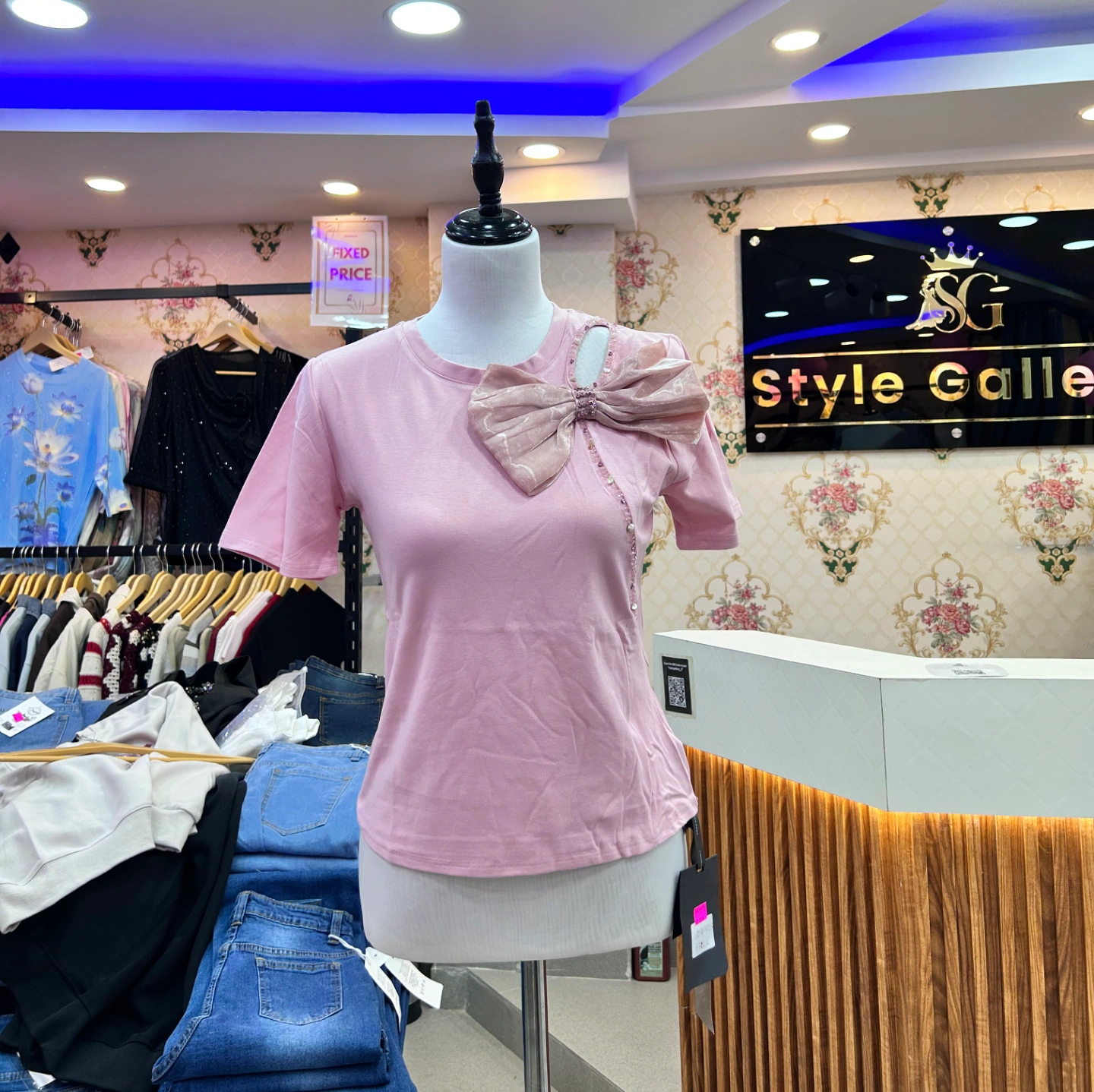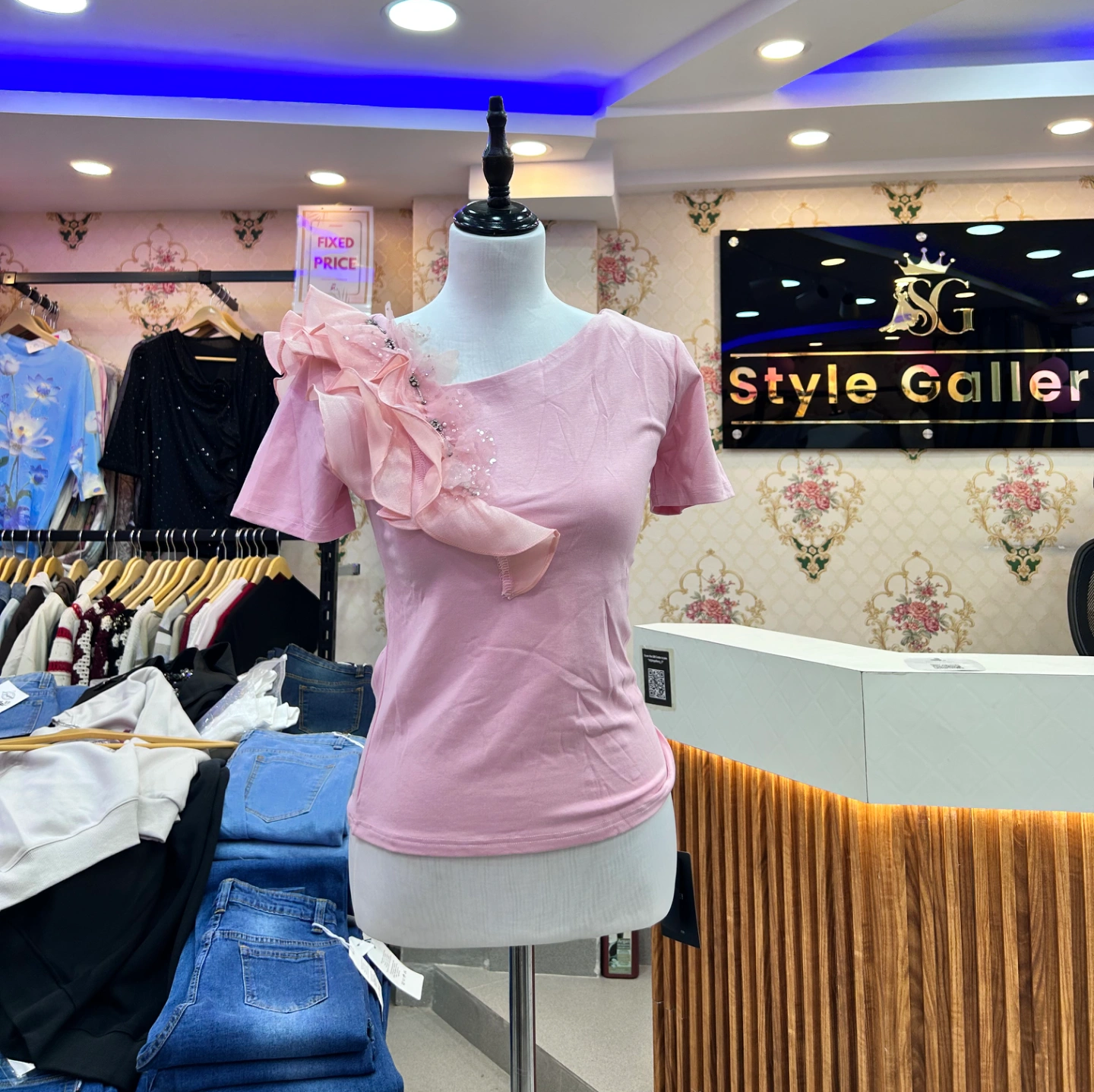 More than just a t-shirt. With a delicate ruffle and shoulder cutout, this top is ready for date night or a fashionable day out.