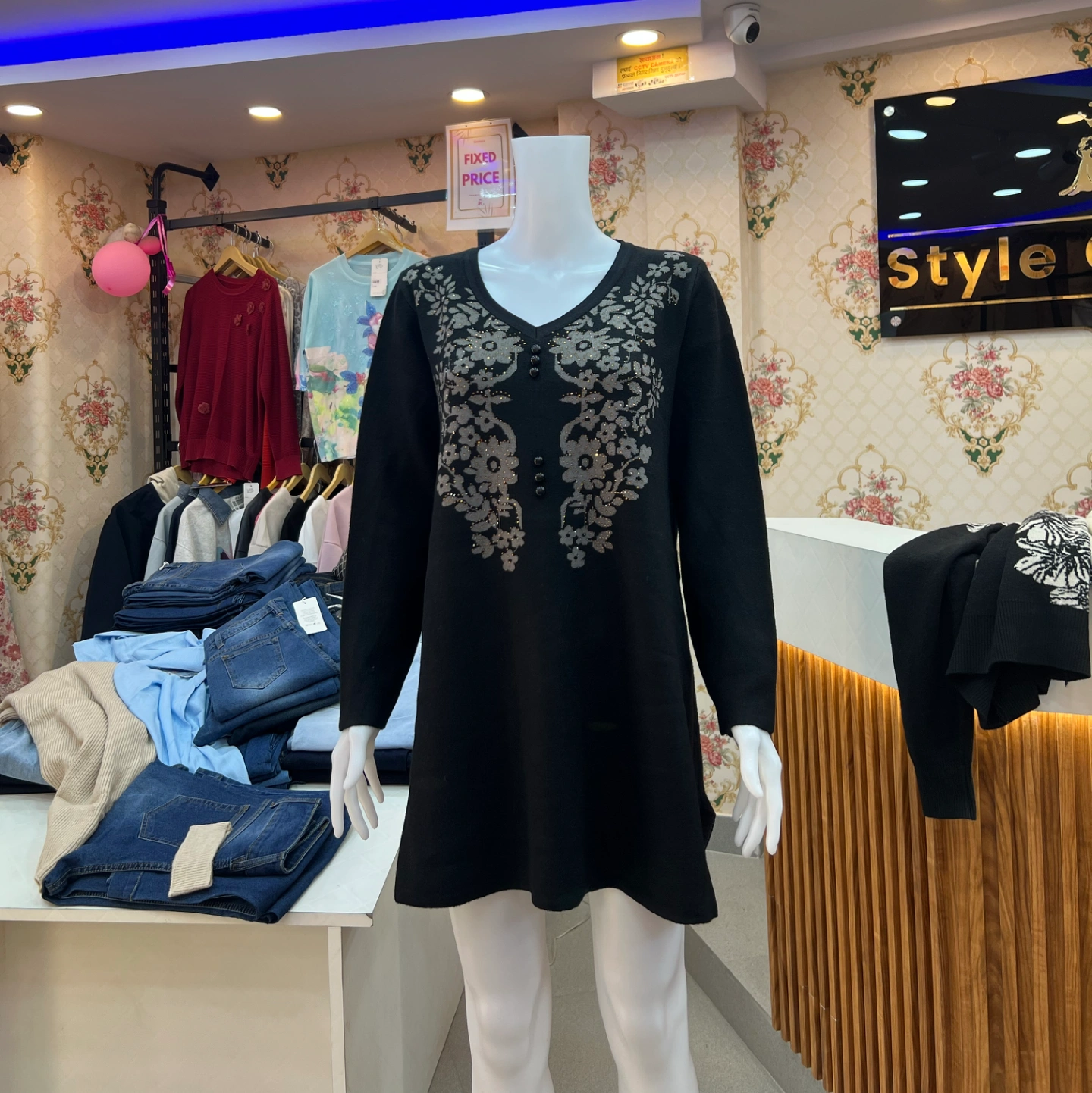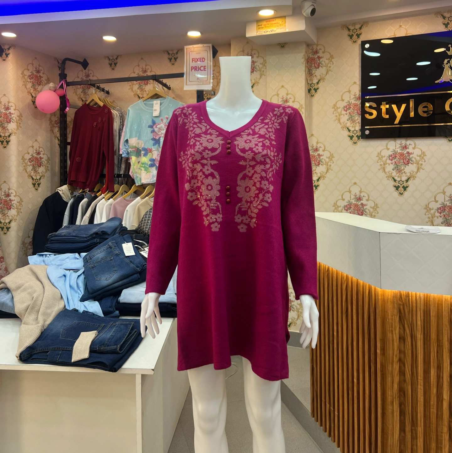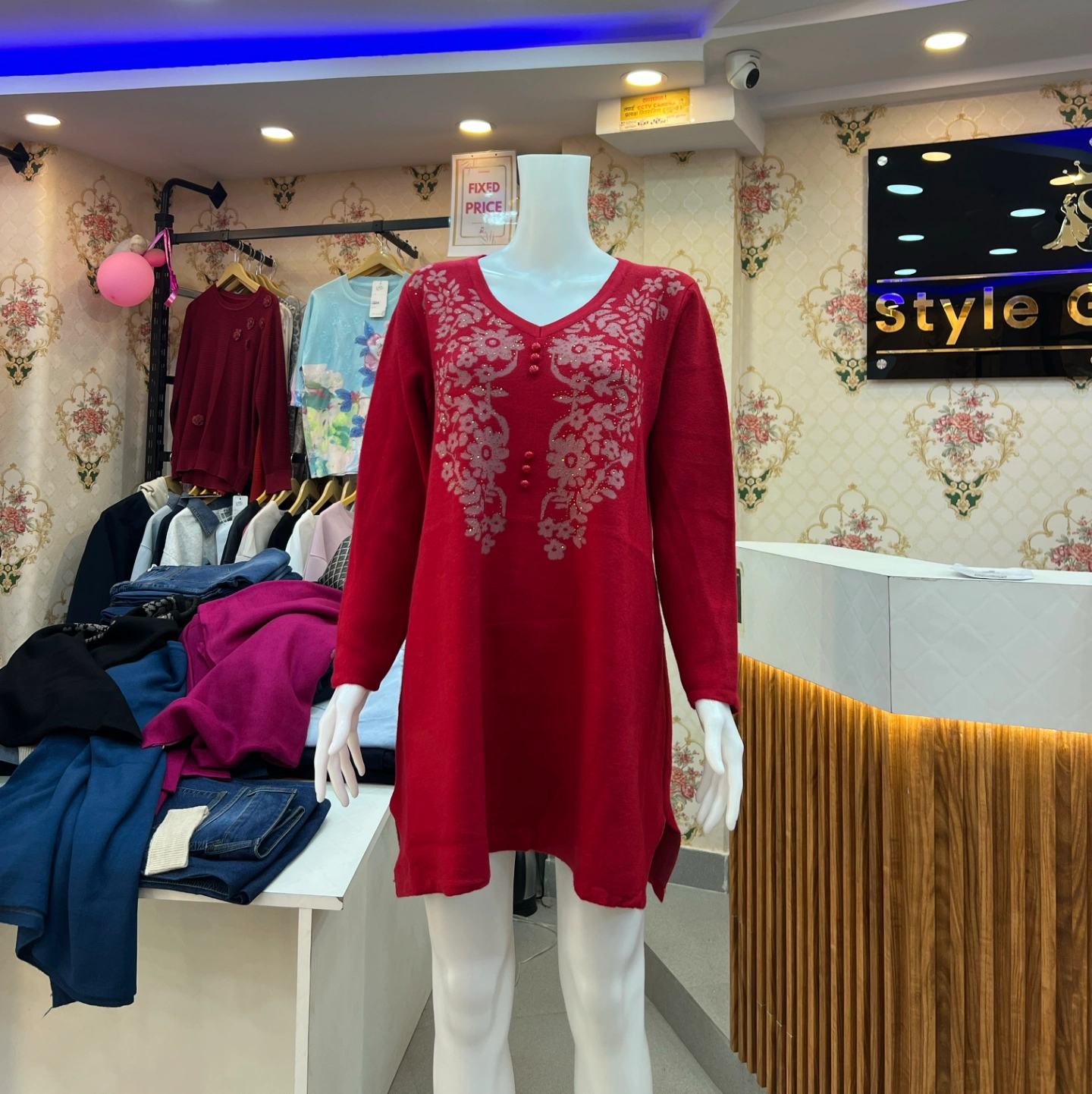 Add a touch of elegance to your winter collection with this floral embroidered woolen dress. Crafted from soft, warm woolen fabric, it features intricate floral embroidery along the neckline and front, creating a graceful and refined look. The relaxed fit and long sleeves make it perfect for both casual outings and semi-formal occasions.