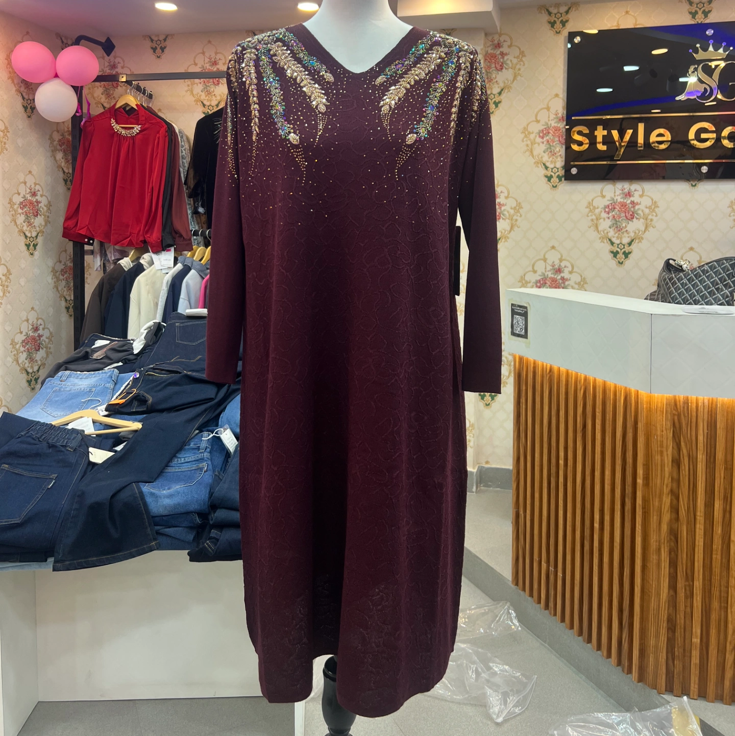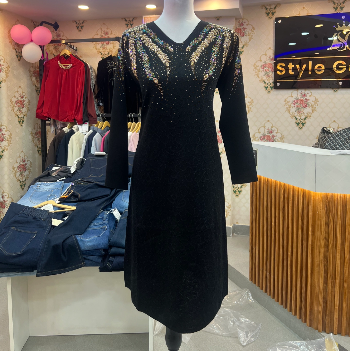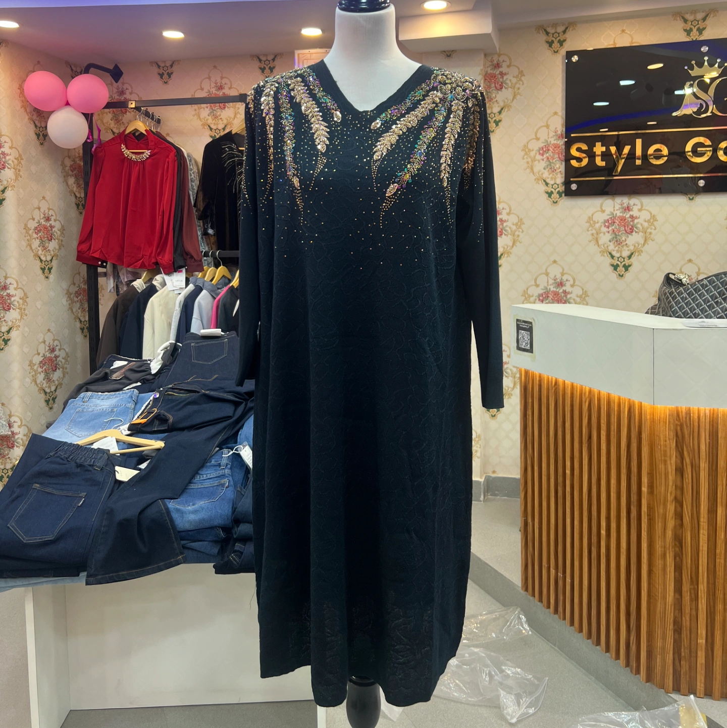 Step out in elegance and warmth with this Woolen Acrylic Stone One-Piece. Crafted from soft and cozy woolen acrylic fabric, it features delicate stone embellishments that add a subtle sparkle to your outfit. The free-size design ensures a comfortable fit for most body types, making it perfect for casual outings, festive occasions, or cozy winter days. This one-piece effortlessly combines style, comfort, and sophistication.