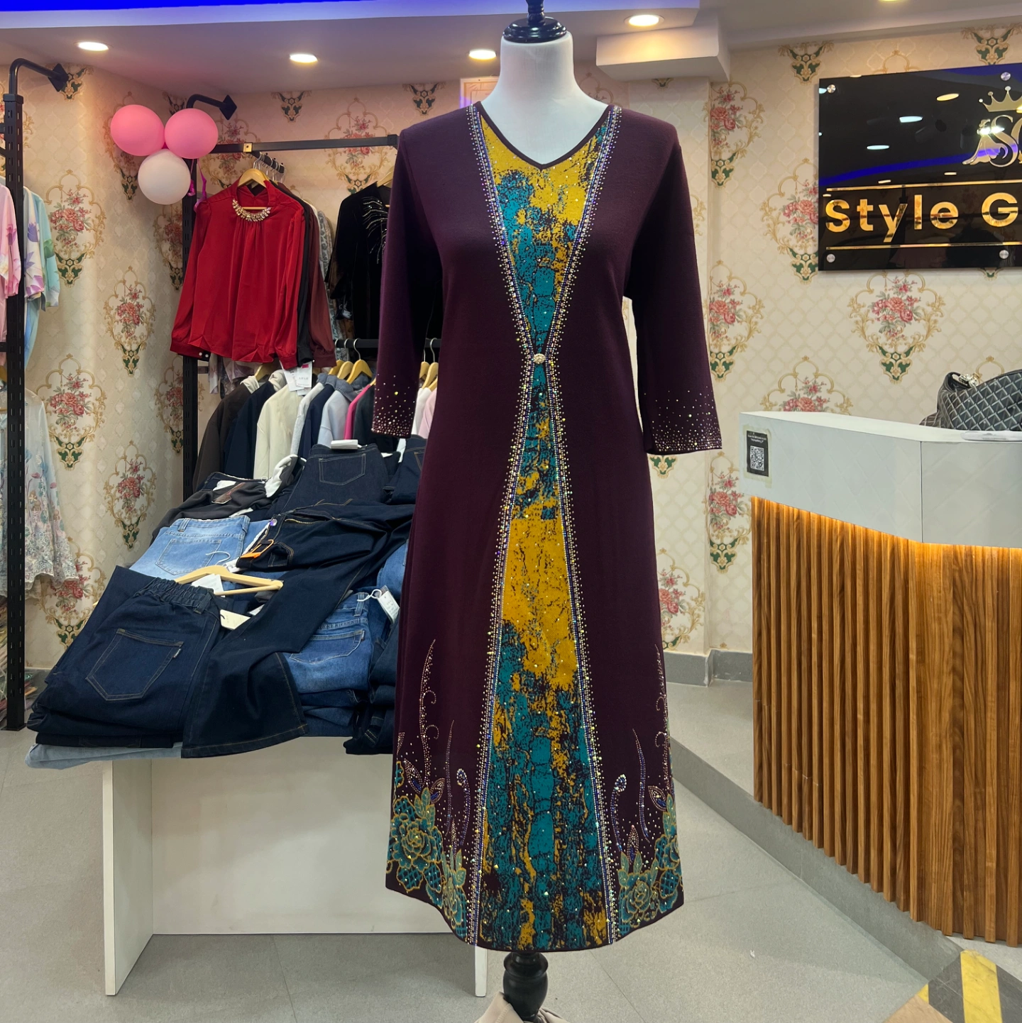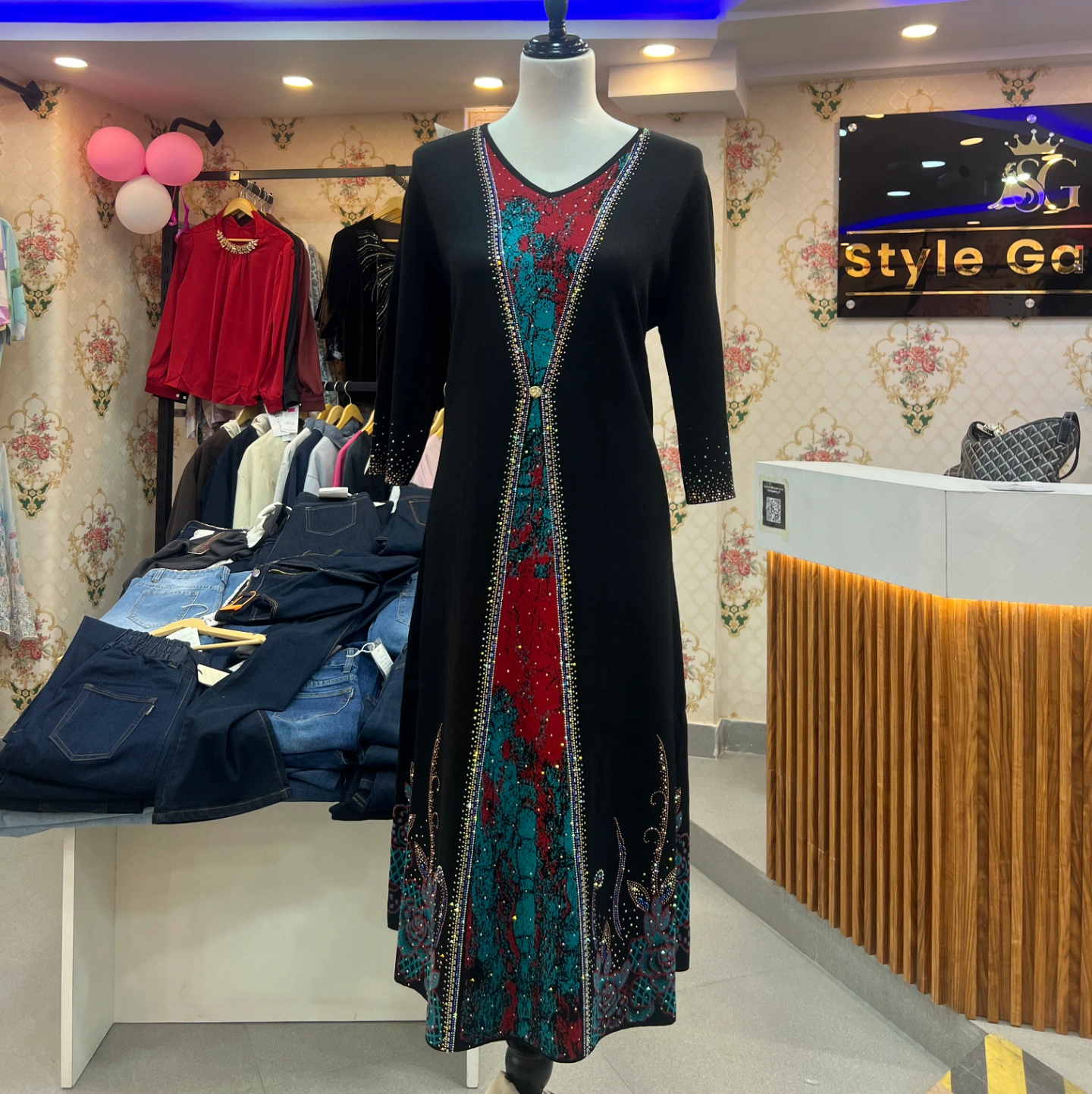 Step out in elegance and warmth with this Woolen Acrylic Stone One-Piece. Crafted from soft and cozy woolen acrylic fabric, it features delicate stone embellishments that add a subtle sparkle to your outfit. The free-size design ensures a comfortable fit for most body types, making it perfect for casual outings, festive occasions, or cozy winter days. This one-piece effortlessly combines style, comfort, and sophistication.